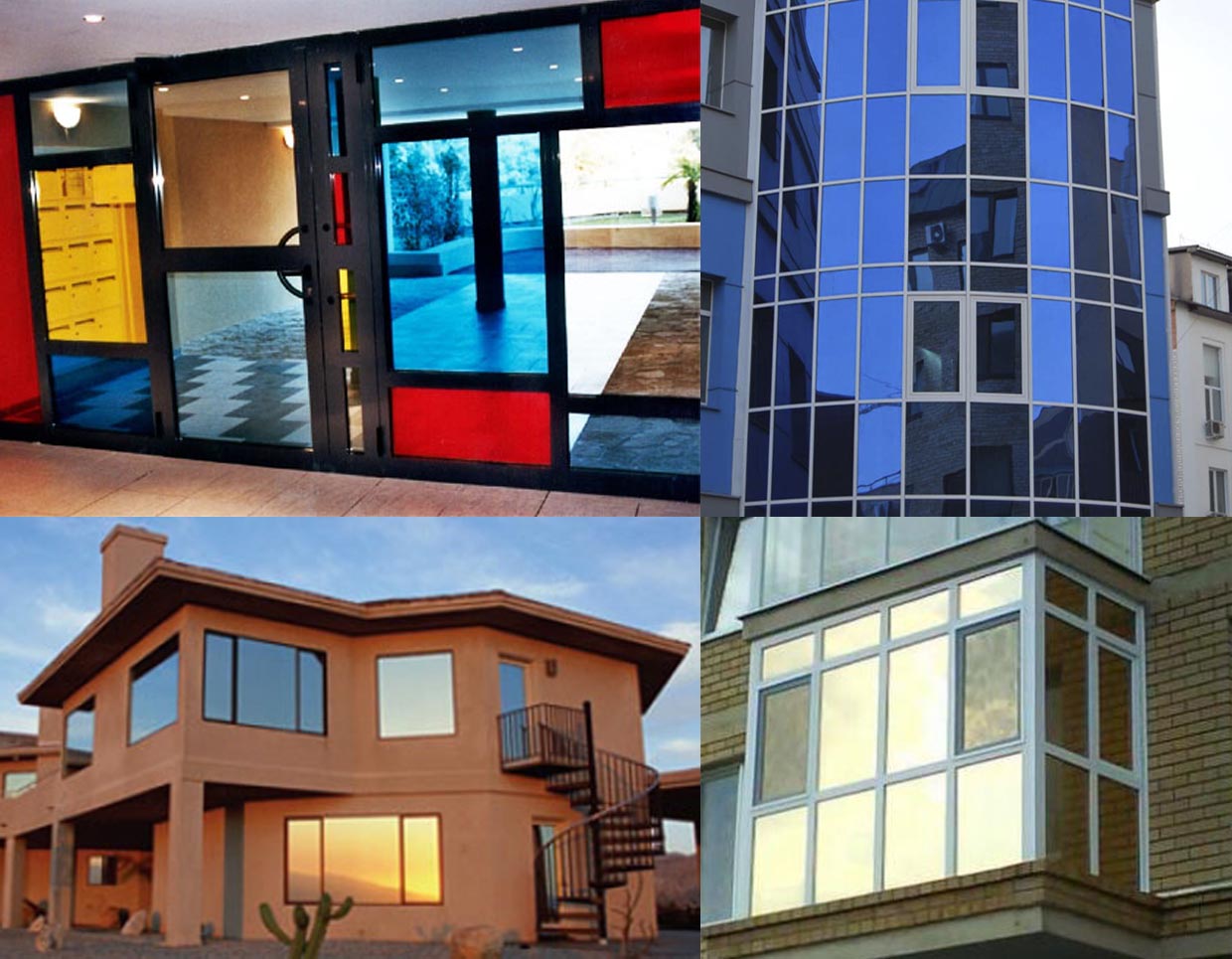 Для окон на фасаде любого здания – чтобы обновить его при помощи зеркальной пленки на окна, золотистого или
